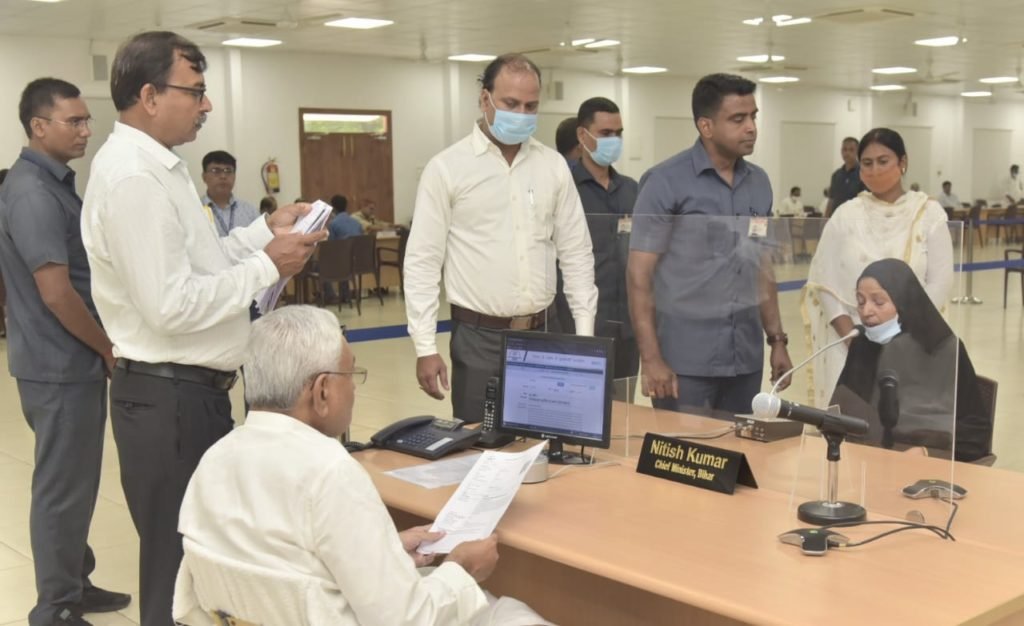 पटना- मुख्यमंत्री नीतीश कुमार आज 4 देशरत्न मार्ग स्थित मुख्यमंत्री सचिवालय परिसर में आयोजित जनता के दरबार में मुख्यमंत्री कार्यक्रम में शामिल हुए जनता के दरबार में मुख्यमंत्री कार्यक्रम में मुख्यमंत्री ने राज्य के विभिन्न जिलों से पहुंचे 59 लोगों की समस्याओं को सुना और संबंधित विभागों के अधिकारियों को समाधान के लिए समुचित कार्रवाई के निर्देश दिए। आज ‘जनता के दरबार में मुख्यमंत्री कार्यक्रम में सामान्य प्रशासन विभाग, गृह विभाग, राजस्व एवं भूमि सुधार विभाग, मद्य निषेध, उत्पाद एवं निबंधन विभाग, निगरानी विभाग, खान एवं भूतत्व विभाग, निर्वाचन विभाग, मंत्रिमंडल सचिवालय विभाग एवं संसदीय कार्य विभाग से संबंधित मामलों पर सुनवाई हुयी।