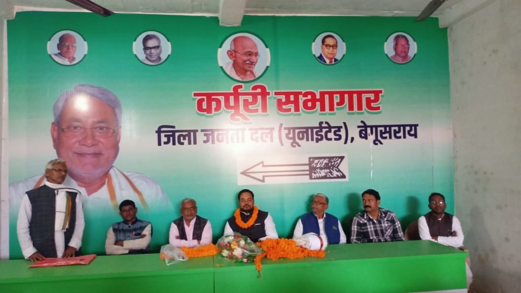 जनता दल यूनाइटेड कार्यालय बेगूसराय में किसान प्रकोष्ठ काआज बैठक हुआ बैठक का मुख्य अतिथि किसान प्रकोष्ठ के प्रदेश अध्यक्ष श्री राम बालक सिंह बैठक के माध्यम से श्री सिंह ने कहा 2005 के बाद माननीय मुख्यमंत्री श्री नीतीश कुमार के सरकार में किसानों का विकास हुआ किसानों के लिए सभी जिलों के हर गांव में हर खेत में बिजली उपलब्ध कराया समय-समय पर किसानों के लिए खाद उपलब्ध कराया उन्नत किस्म के बीज उपलब्ध कराया बिहार में कृषि का क्रांति ला दिया श्री सिंह ने कहा माननीय मुख्यमंत्री श्री नीतीश कुमार बिहार में विकास का इतिहास रचा साथ ही साथ किसान प्रकोष्ठ को मजबूत करने हेतु नए जिला अध्यक्ष नियुक्त करने पर चर्चा किया इस बैठक की अध्यक्षता कर रहे जिला अध्यक्ष श्री रुदल राय ने कहा 2005 से पहले बाढ़ फसल छाती का मुआवजा नहीं मिलता था लेकिन माननीय मुख्यमंत्री श्री नीतीश कुमार के सरकार में बाढ़ छाती मिलता है एवं श्री राय ने किसान प्रकोष्ठ के मजबूती के लिए किसान प्रकोष्ठ प्रदेशाध्यक्ष श्री रामबालक सिंह से उपेक्षा किया की पार्टी के मजबूती के लिए प्रदेश अध्यक्ष बहुत अच्छे हैं साथ ही साथ श्री राय ने कहा बिहार को विशेष राज्य का दर्जा मिलने चाहिए, एवं जातीय जनगणना होनी चाहिए बैठक का संचालन किसान प्रकोष्ठ के पूर्व जिला अध्यक्ष श्री अनिल चौधरी ने किया बैठक में उपस्थित जदयू प्रवक्ता वीरेंद्र कुमार पटेल, जवाहर लाल भारद्वाज, अरुण महतो ,रविंद्र निराला, जयकुमार, राम सुंदर कुशवाहा, बिरजू चंद्रवंशी, अजय पासवान बिच्छू महतो बालेश्वर महतो, राहुल कुमार बमबम कुमार अनिल पटेल रामराज महतो पंकज सिंह डॉक्टर लुलु अंसारी दिलीप कुमार विकास कुशवाहा हरिनंदन चौरसिया एवं सैकड़ों साथी गण