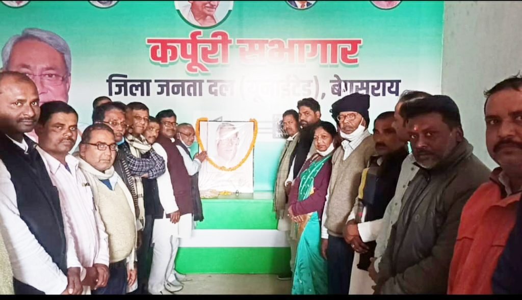 बेगूसराय जिला जनता दल यू के कार्यालय में जननायक कर्पूरी ठाकुर जी की पुण्यतिथि मनाई गई इस कार्यक्रम की अध्यक्षता करते हुए श्री रुदल राय ने बताया कि कर्पूरी ठाकुर व्यक्ति नहीं थे बल्कि विचारक थे उन्होंने मुख्यमंत्री कार्यकाल में बिहार में पिछरा और अति पिछड़ा का वर्गीकरण कराना उन्होंने समाज के अंतिम पायदान पर खरे समाज को 1977 में अति पिछड़ों को 12% पिछड़ा को 8% एवं 3% महिला और 3% आर्थिक रूप से ऊंची जातियों के लिए नौकरी में आरक्षण दिया जननायक कर्पूरी ठाकुर के मरने के बाद बिहार के मुख्यमंत्री श्री नीतीश कुमार कर्पूरी ठाकुर के सपनों का साकार कर रहे हैं बिहार पहला राज्य है 20% अति पिछड़ा 16% दलित एवं 50% महिलाओं को पंचायती राज में अधिकार दिया और वैसे समाज के लोगों को बड़े पैमाने पर मुखिया पंचायत समिति जिला परिषद अध्यक्ष प्रमुख बन रहे हैं मुख्यमंत्री नीतीश कुमार न्याय के साथ विकास कर रहे हैं बिहार में हर समाज के हर तब के का शैक्षणिक आर्थिक रोजगार का विकास हो रहा है श्री रुदल राय ने कर्पूरी पुण्यतिथि पर भारत सरकार से मांग किया है कि जननायक कर्पूरी ठाकुर को भारत रत्न की उपाधि मिले माननीय मुख्यमंत्री श्री नीतीश कुमार बिहार विधान मंडल के दोनों सदनों में सर्वसम्मति से पारित किया है कि जननायक कर्पूरी ठाकुर को भारत रत्न मिले श्री राय ने विशेष राज्य की दर्जे की मांग की और उन्होंने बताया कि जब तक बिहार विकसित नहीं होगा देश विकसित नहीं होगा साथ ही साथ जातीय जनगणना की भी मांग की है इस कार्यक्रम में उपस्थित नगर अध्यक्ष जवाहर भारद्वाज ,जदयू प्रवक्ता वीरेंद्र कुमार पटेल , प्रखंड अध्यक्ष गजानंद राय, पांडव कुमार रमेश राणा रंजीत कुमार सिंह एवं पूर्व प्रवक्ता अरुण महतो कार्यालय प्रभारी सुमित प्रधान, डॉ ए हक अंसारी ,श्याम बिहारी वर्मा, रामराज महतो, शकुंतला गुप्ता, मुकेश जैन, मोहम्मद जियाउल्लाह, दिलीप कुशवाहा, अजय पासवान, बिरजू चंद्रवंशी, अर्चना कुमारी नाथो रजक राहुल कुमार सिंह छात्र जदयू, देवनारायण ठाकुर, मनीष शर्मा, बमबम कुमार, मुकेश राय एवं तमाम साथी मौजूद थे ले