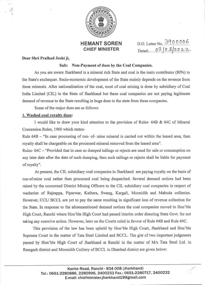 रांची:-कोयला कंपनियों के ऊपर झारखण्ड का कुल बकाया लगभग 1.36 लाख करोड़ रुपये है जिसके भुगतान हेतु,झारखण्ड के मुख्यमंत्री ने कोयला मंत्र प्रह्लाद जोशी को पत्र लिखा है।
