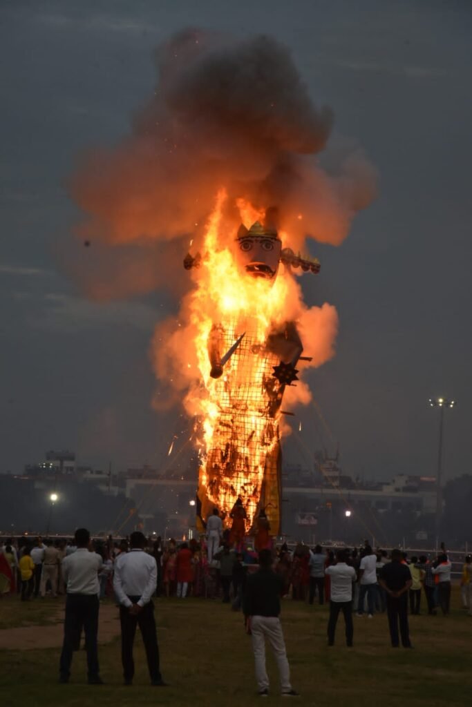 इसके पश्चात् मुख्यमंत्री ने श्रीराम, एवं श्री लक्ष्मण के स्वरूप को तिलक लगाकर उनकी आरती की। तत्पश्चात् बारी-बारी से बुराई के प्रतीक कुंभकरण, मेघनाद एवं रावण का पुतला दहन किया गया।