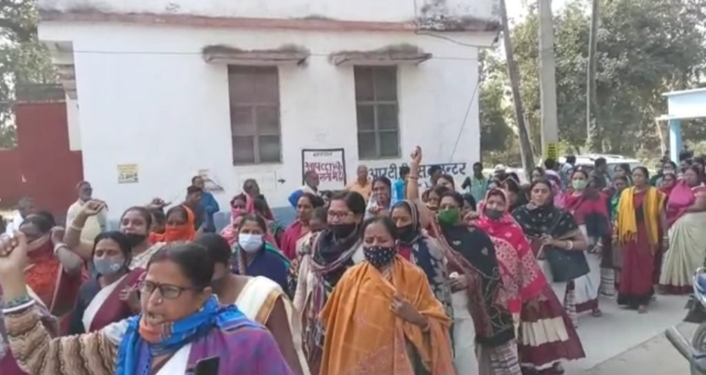 बीस सुत्री मांगो को लेकर आंगनबाड़ी सेविकाओं ने दिया एक दिवसीय धरना